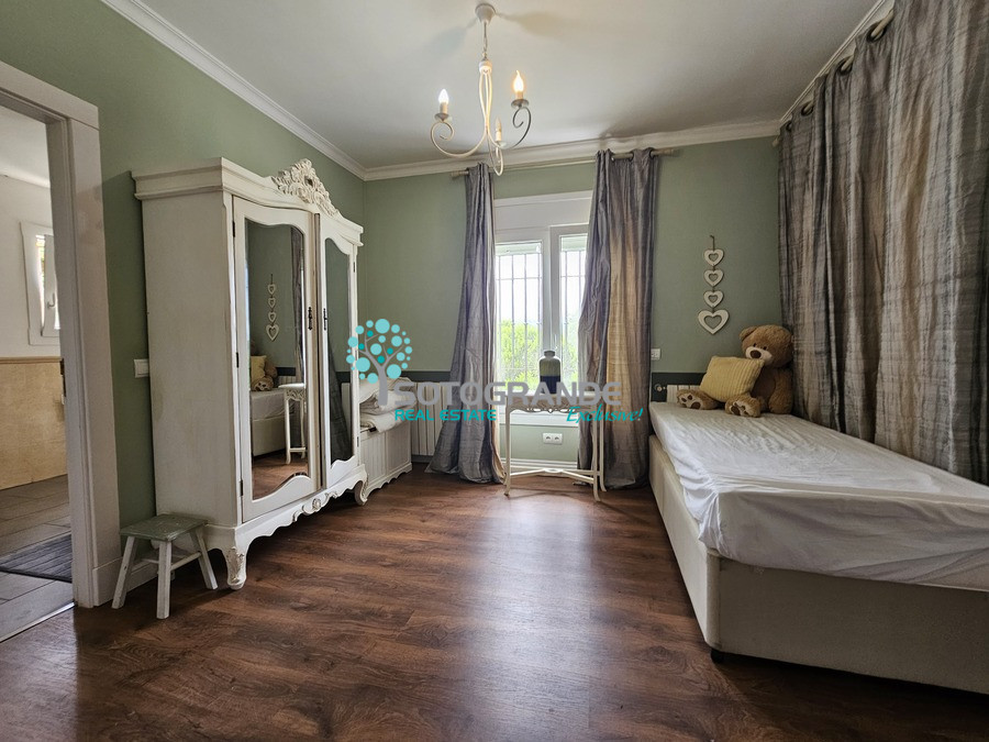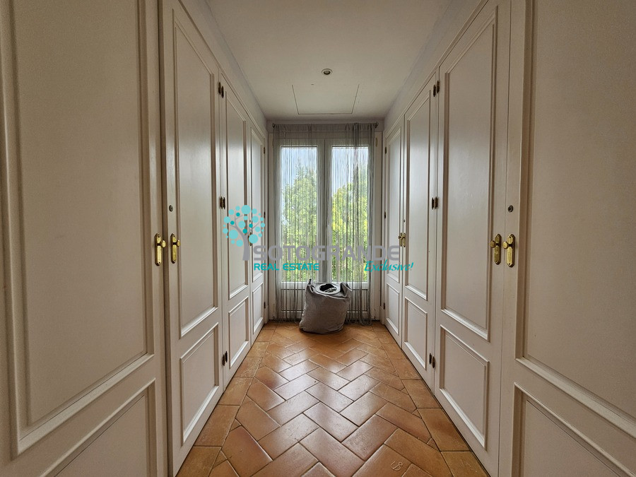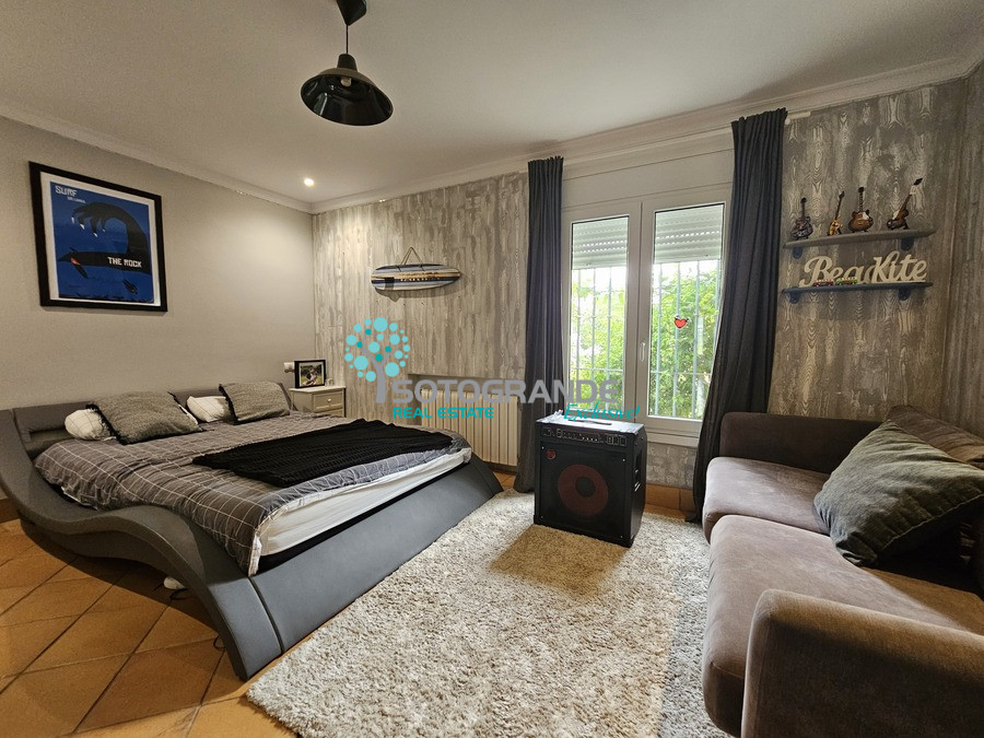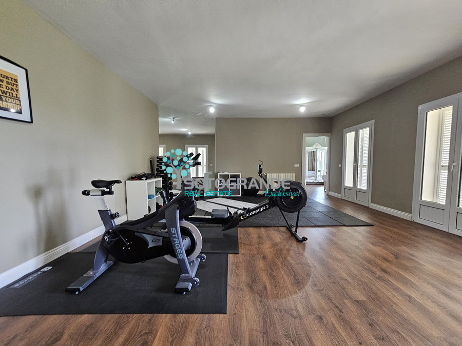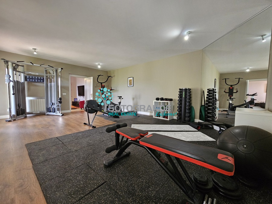 This rental villa is built on three levels. On the ground floor you will find a reception hall with guest toilet, a very bright living room with fireplace, a very spacious kitchen with an island and dining area, an indpendent laundry room, as well es two en suite bedrooms and two terraces. The top floor is occupied by the master suite with en suite bathroom (bathtub and shower), a walk in closet and a terrace with very nice green views. The basement is destined for a TV/play room, a spacious private gym and a guest room with en suite bathroom.
