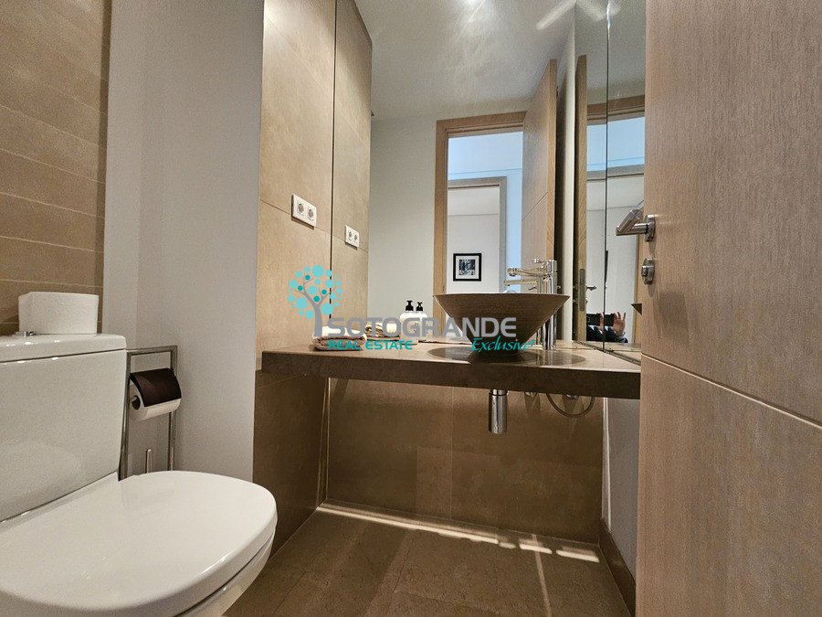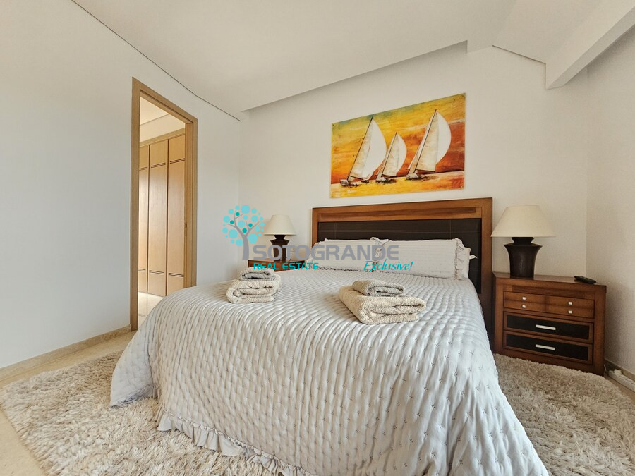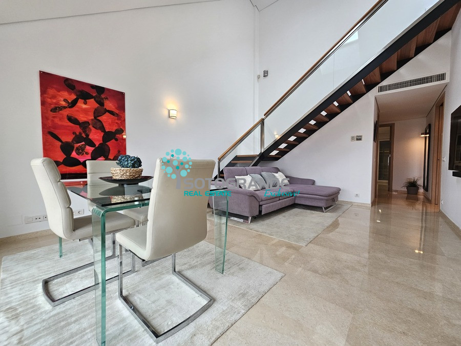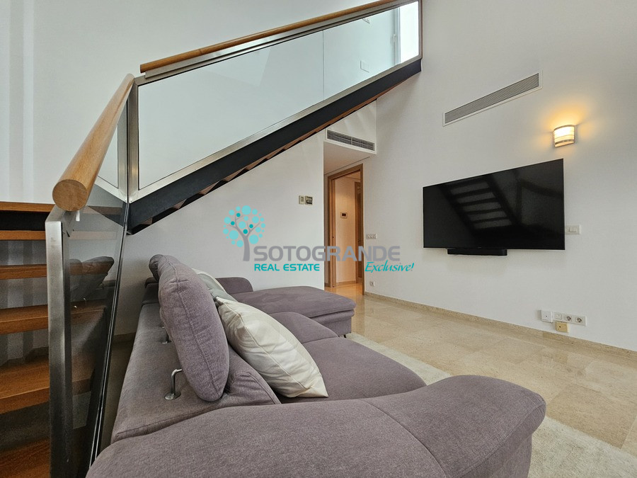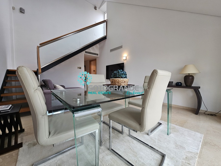 Beautiful duplex penthouse for school-term rent in Ribera del Marlin, Sotogrande Marina. The property consists of a homely living room with dining area and marble floors leading through Schüco designed fully foldable windows to a terrace with breathtaking views across the Sotogrande Marina canals and the Mediterranean Sea. A guest toilet. Fully fitted kitchen with Smeg / Siemens appliances and a separate laundry room.