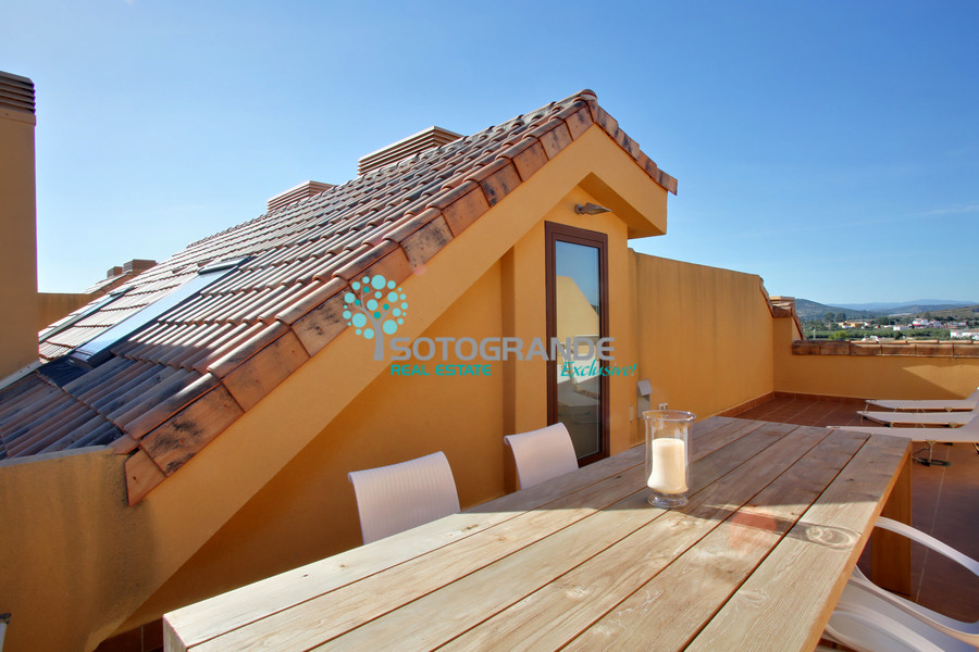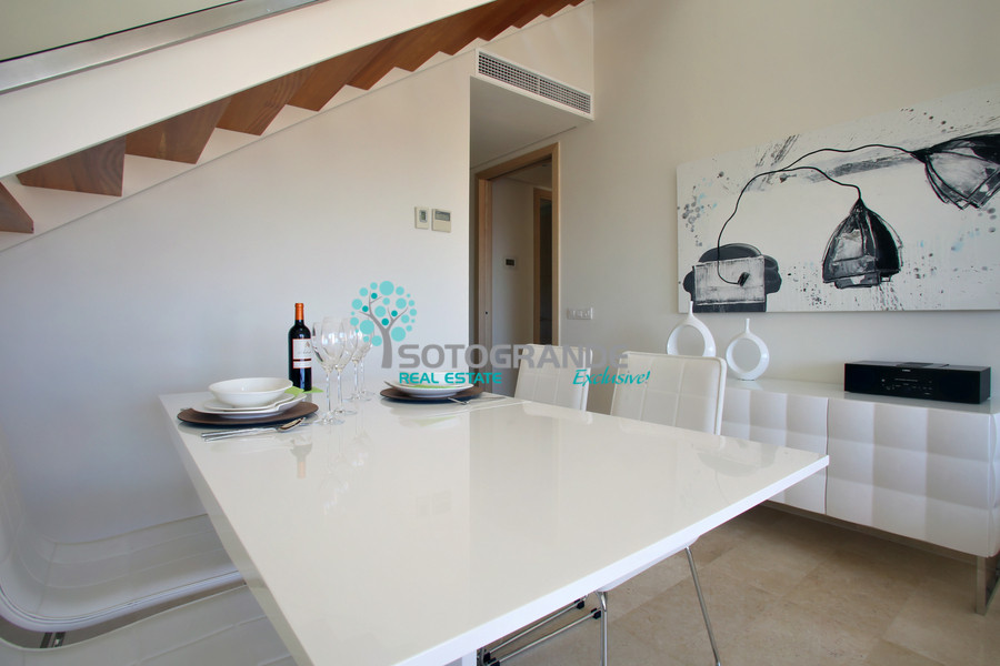 Beautiful duplex penthouse for rent in Ribera del Marlin, Sotogrande Marina. The property consists of a homely living room with fireplace and dining area. Marble floors leading through Schüco designed windows to a terrace with breathtaking views across the Sotogrande Marina canals, Mediterranean Sea and Gibraltar. Guest cloakroom. Fully fitted kitchen with Smeg / Siemens appliances and separate laundry room.