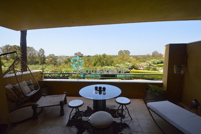 This 3-bedroom apartment is located on the second floor. Modern decorated. A large living room with fireplace and direct doors to the outside covered 40 m2 terrace. Overlooking the Ribera del Rio gardens with communal swimming pool. Great views towards the River Guadiaro and the Mediterranean Sea. Also views towards the Sotogrande country side. Open plan dining room.