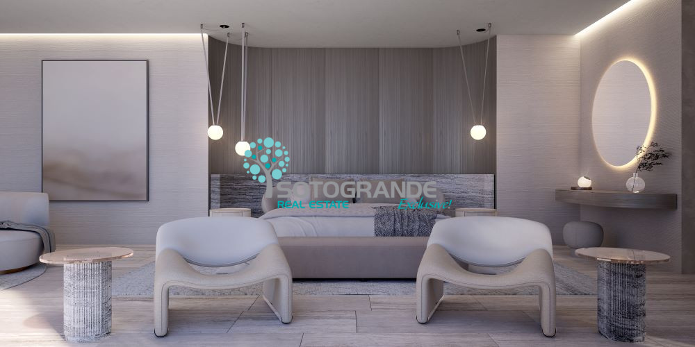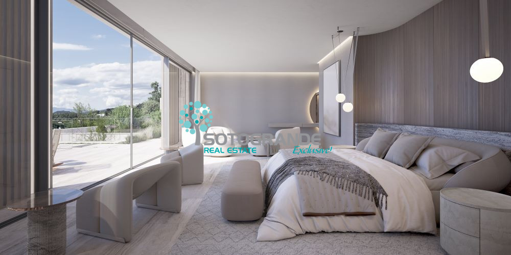 The project includes a total of 7 bedrooms. The master suite, approximately 200 m² in size, includes a bedroom, dressing room, bathroom, and a private terrace with open views. Four guest suites, a separate guest suite, and an en-suite staff room are also planned.