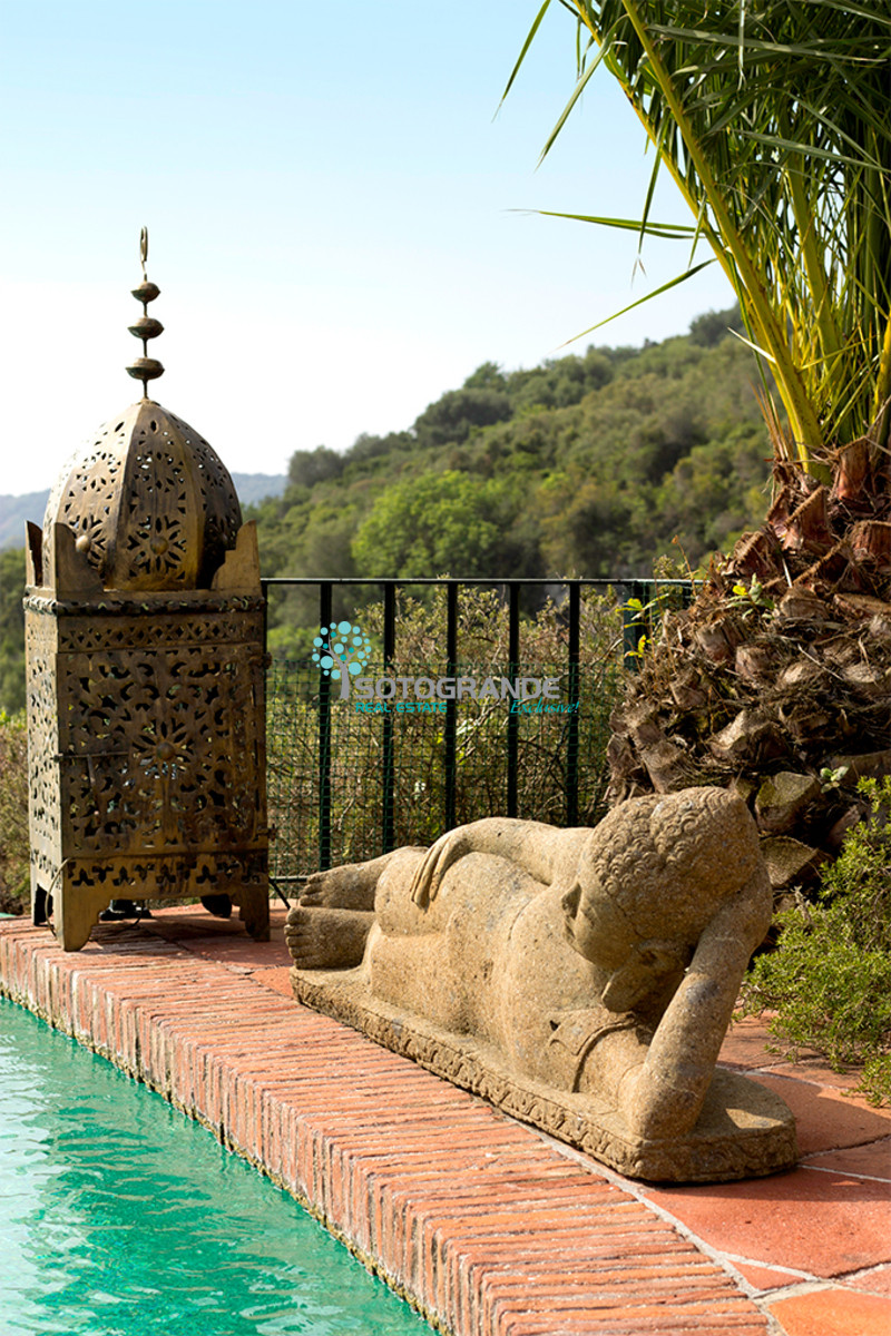 A unique villa located in Sotogrande Alto, bordering the nature reserve, which combines the traditional rural Spanish arquitecture together with Al-Andalus influence. It fascinates with the simplicity, harmony and natural elegance that arises from the mixture of its architectural elements, gardens and art pieces delicately chosen through time and that you will find on each wall, each door, mosaic or plinth.